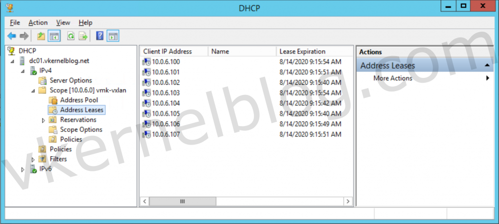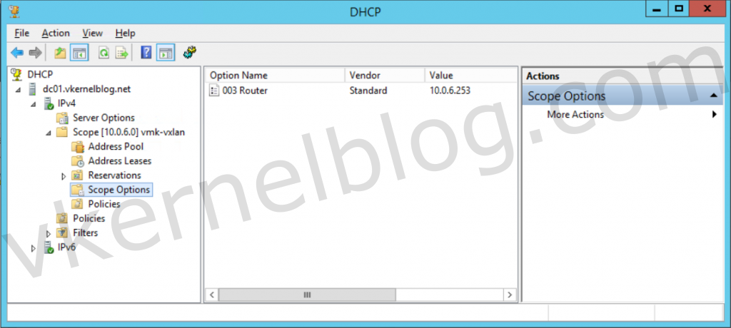 DHCP service is running on my domain controller in my test lab. I have added a DHCP scope that will be used for the VXLAN VMkernel ports. Configure the scope options to use the following options as shown in the picture below.