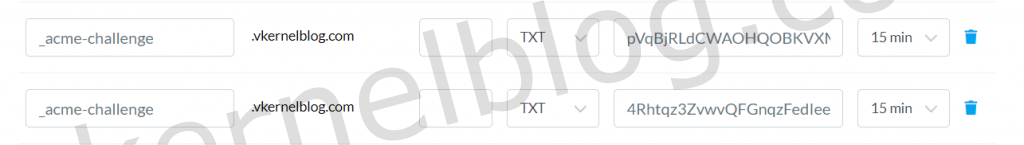 The next step is to create two TXT records under my vkernelblog.com domain. These two TXT records will be used to validate your domain name. In my case, I needed to create two TXT records with the following values: